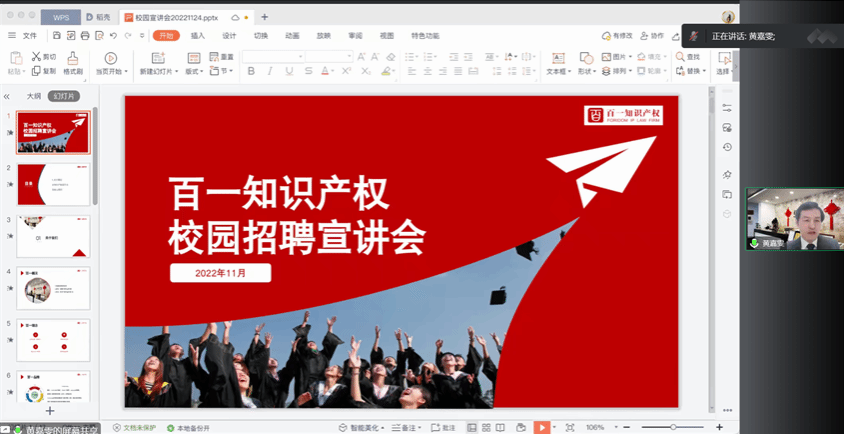 上海百一知识产权代理有限公司总经理王奎宇校友介绍了百一理念、品牌与获奖情况。该所十分认可beat365唯一官方网站学生的水平,欢迎法学各专业的学生积极报名加入。王奎宇校友还讲述了我国知识产权立法及发展,介绍了该所的青年律师成长路径与福利待遇、招聘流程、招聘岗位要求等内容。