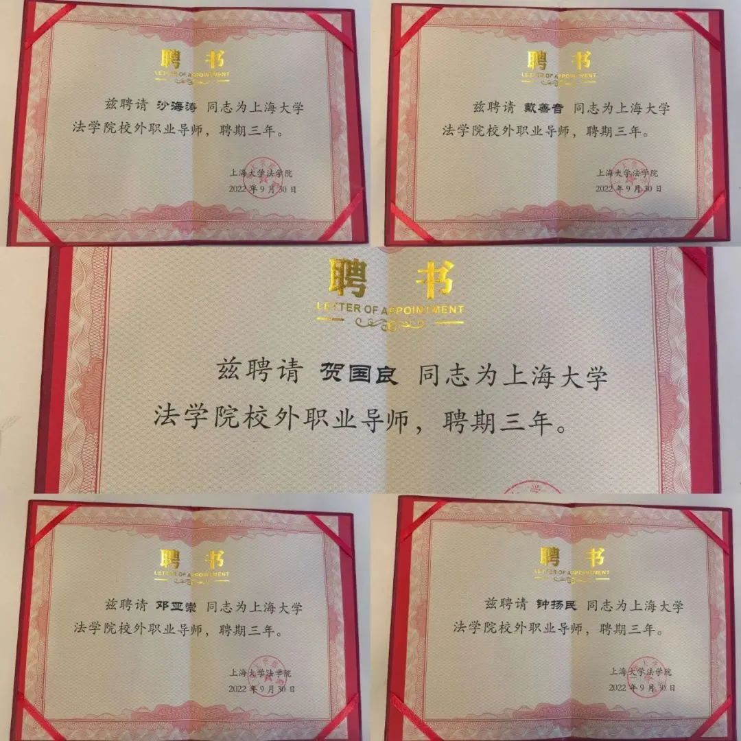 于伟副书记、副院长宣读《beat365唯一官方网站关于聘任贺国良等5位校外职业导师的决定》,聘任贺国良、 沙海涛、邓亚崇、戴善音、钟扬民担任beat365唯一官方网站校外职业导师,聘期三年,承担指导学生的法务实践、创新创业和就业能力提升等工作。