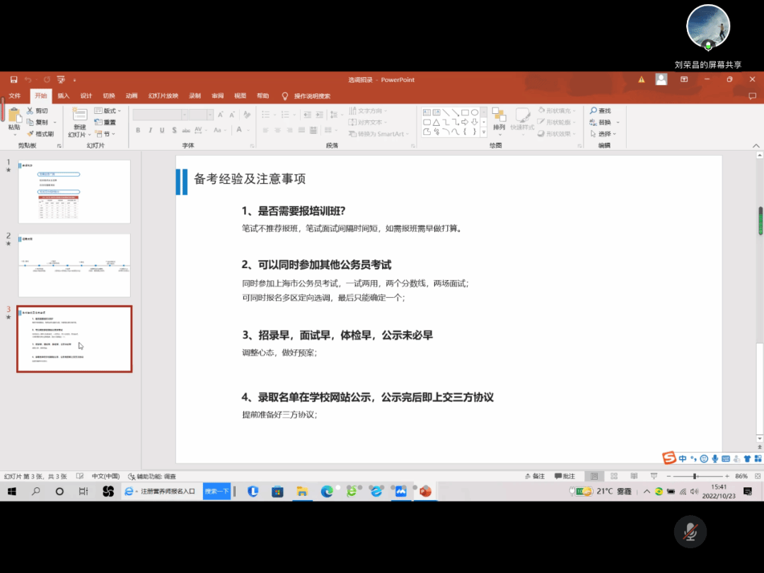 刘荣昌校友作为宝山区定向选调生,给大家介绍了专向选调与定向选调的联系和区别,重点介绍了上海市特殊的“一试两用”,建议同学们可以同时参加定向选调与上海公务员市考,拥有多一份选择,提前做好自己的职业规划。