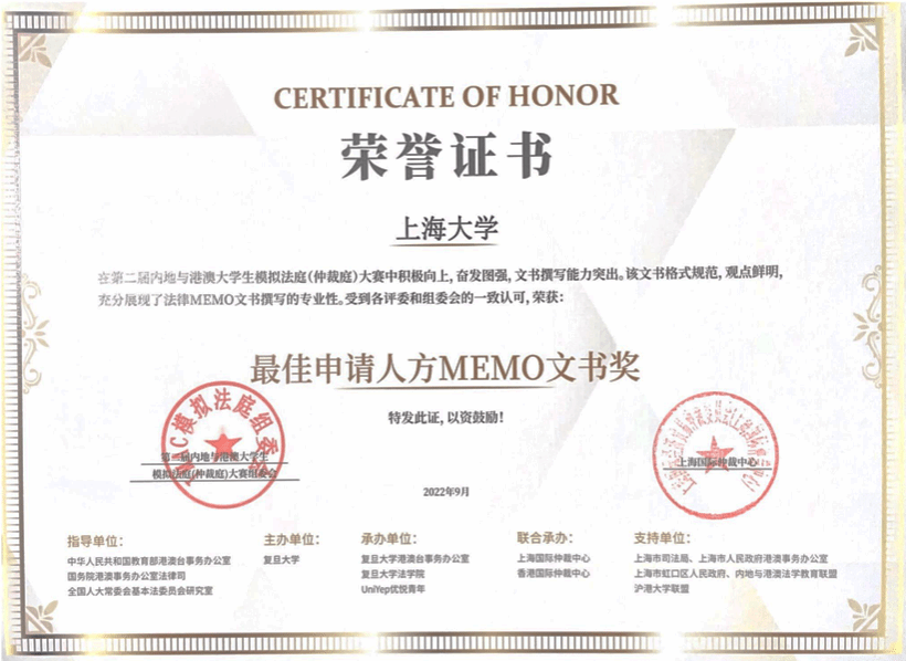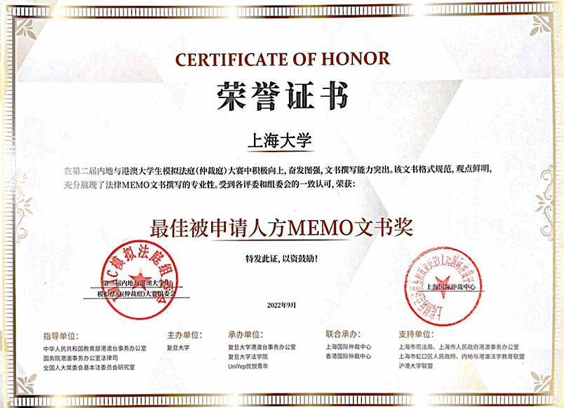beat365唯一官方网站代表队荣获最佳申请人方MEMO文书奖
