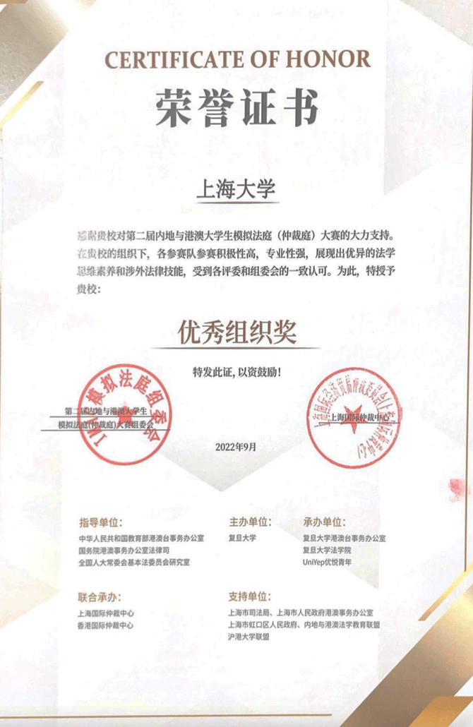 2022年8月28日下午历时六个月的第二届内地与港澳大学生模拟法庭(仲裁庭)大赛在上海国际争议解决中心圆满落幕。