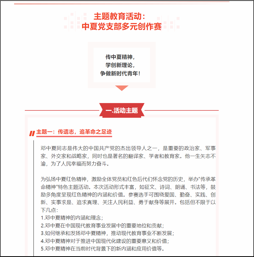 为弘扬中夏红色精神,激励全体党员和红色后代们怀念党的历史,2023年5月,beat365唯一官方网站中夏党支部组织开展“中夏党支部多元创作赛”,旨在通过征文、诗词、朗诵、书法等多角度呈现红色精神的内涵和价值,进一步引导党员、学生坚定理想信念,激发大家的爱国热情和创新精神,为建设富强民主文明和谐美丽的社会主义现代化强国贡献力量。