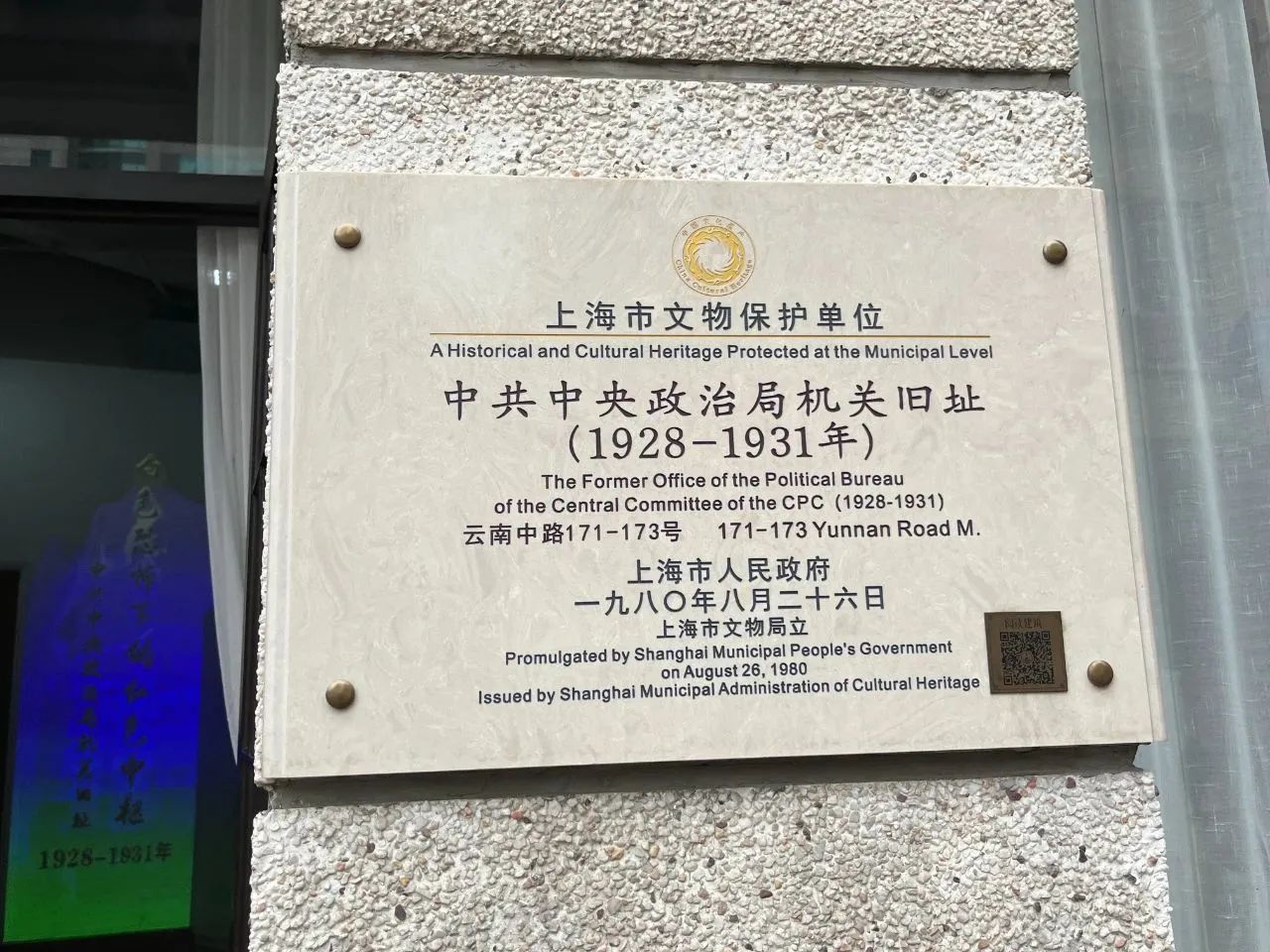 (图为中共中央政治局机关旧址牌)