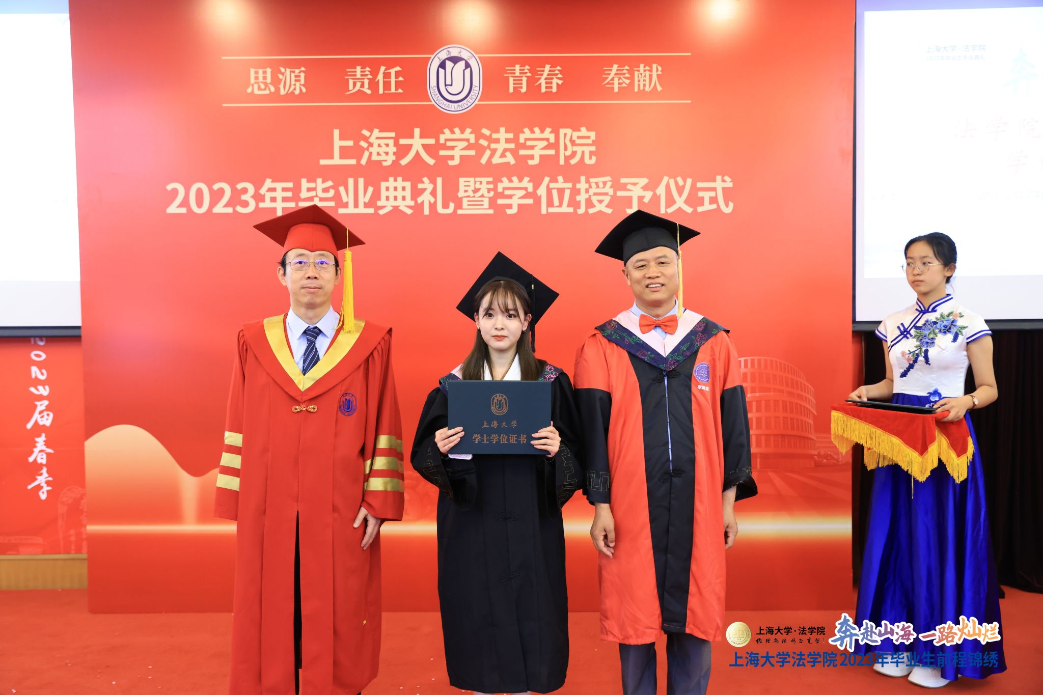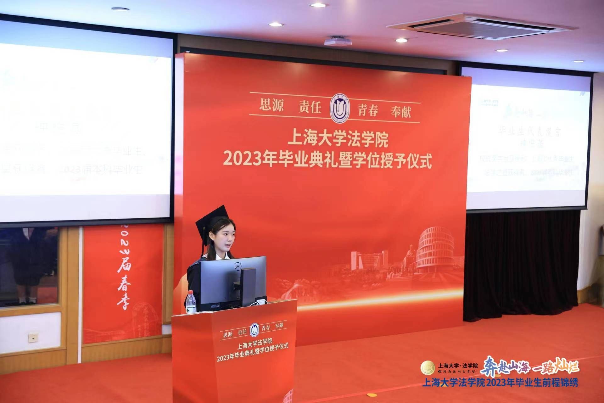 校长奖学金获得者、上海市优秀毕业生、法学之星获得者、2023年本科毕业生钟悦菡同学作为本科毕业生代表发言。她回望了上大四年的本科的生活,感恩beat365唯一官方网站这片沃土、感谢beat365唯一官方网站与老师们的辛勤培养和家人友人的支持与陪伴。追风赶月莫停留,平芜尽处是春山。她祝福大家永葆赤子之心勇毅前行,在人生更高处相逢。
