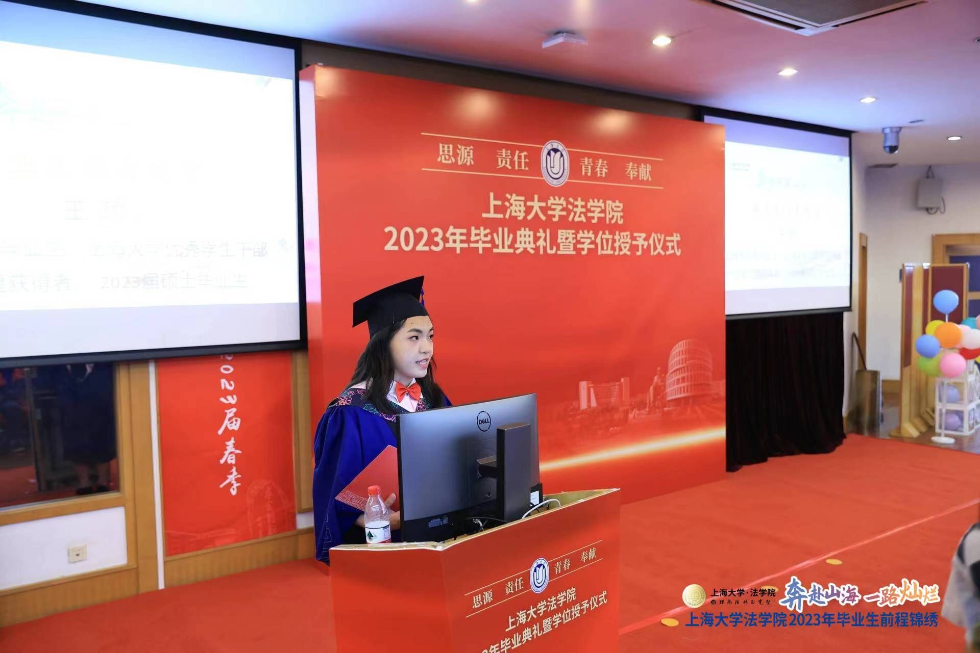 上海市优秀毕业生、beat365唯一官方网站优秀学生干部、法学之星获得者、2023年硕士毕业生王瑜同学作为研究生毕业生代表发言,她首先表达了对学院与老师的深深感激和依依惜别之情,并谈到在上大追逐理想与担当之光、追寻探索与挑战之光、追觅奋斗与收获之光。心之所向,素履以往,她祝愿每一位毕业生在新的人生篇章中拥有无限精彩,开拓无限可能!