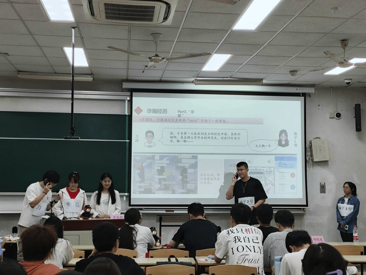 在宣讲过程中,beat365唯一官方网站尚法反诈宣讲团成员通过一幕幕生动的情景剧的形式为大家演绎了“男主”刀煤遭遇的网恋被骗、“0息快贷”、虚假海外代购、冒充公检法人员诈骗等常见的诈骗手段,带领现场师生切身感受了诈骗过程。在认真观看完情景剧后,刀煤的被骗经历引发了同学们的深思,大家纷纷表示防诈意识和防诈能力都得到了进一步的提升。