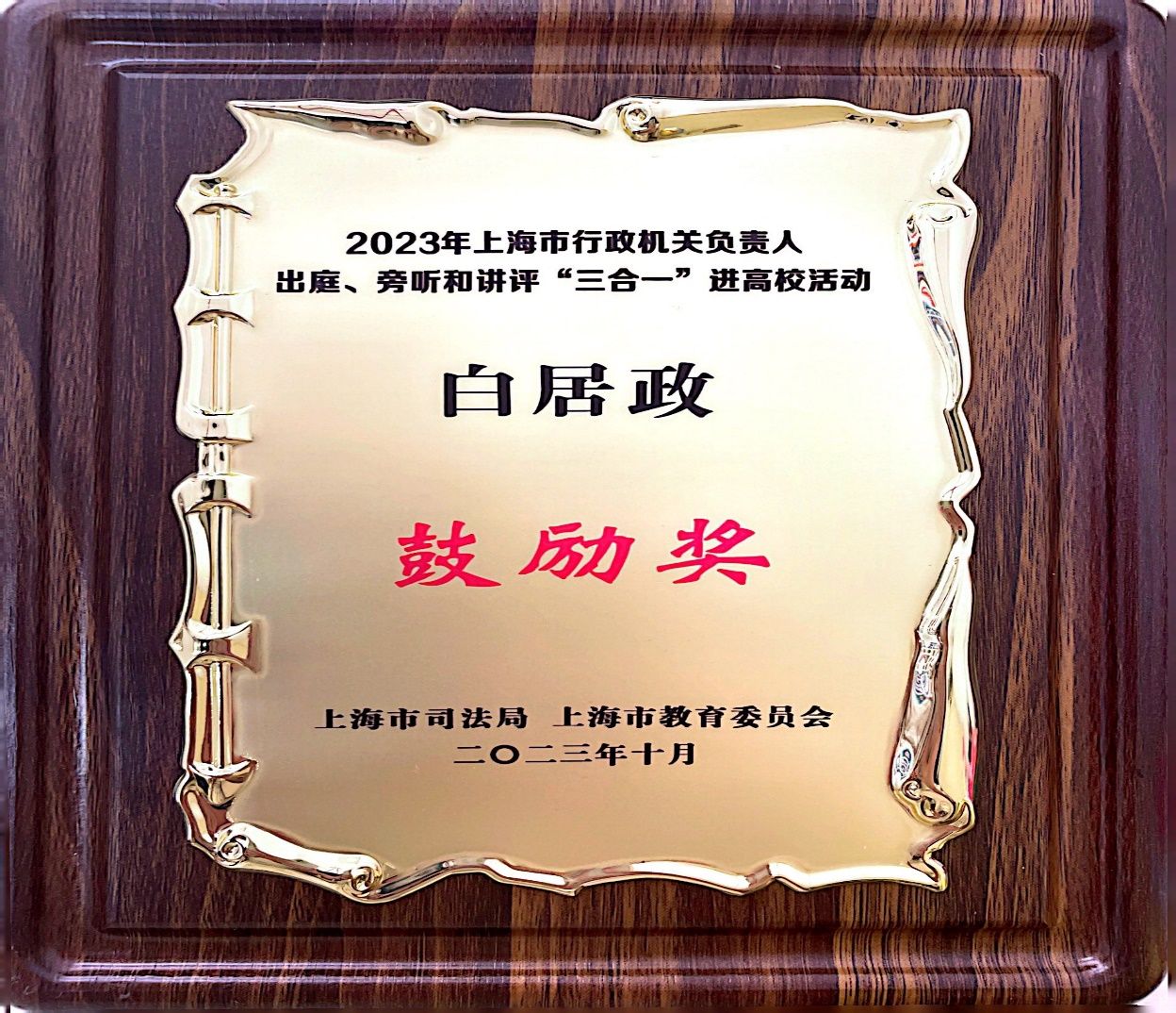 beat365唯一官方网站荣获行政机关负责人出庭、旁听、讲评“三合一”进高校活动优秀组织奖,beat365唯一官方网站白居政同学荣获 “三合一”进高校征文活动鼓励奖。