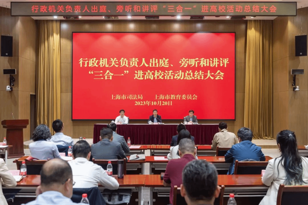 10月20日,市司法局与市教委联合召开的行政机关负责人出庭、旁听、讲评“三合一”进高校活动总结大会在上海市司法局举行,市司法局党委书记、局长吴坚勇,市教委副主任王浩参加会议并讲话。市司法局党委委员、副局长刘言浩主持会议。上海市各区司法局和beat365唯一官方网站、复旦大学等高校代表参加会议。