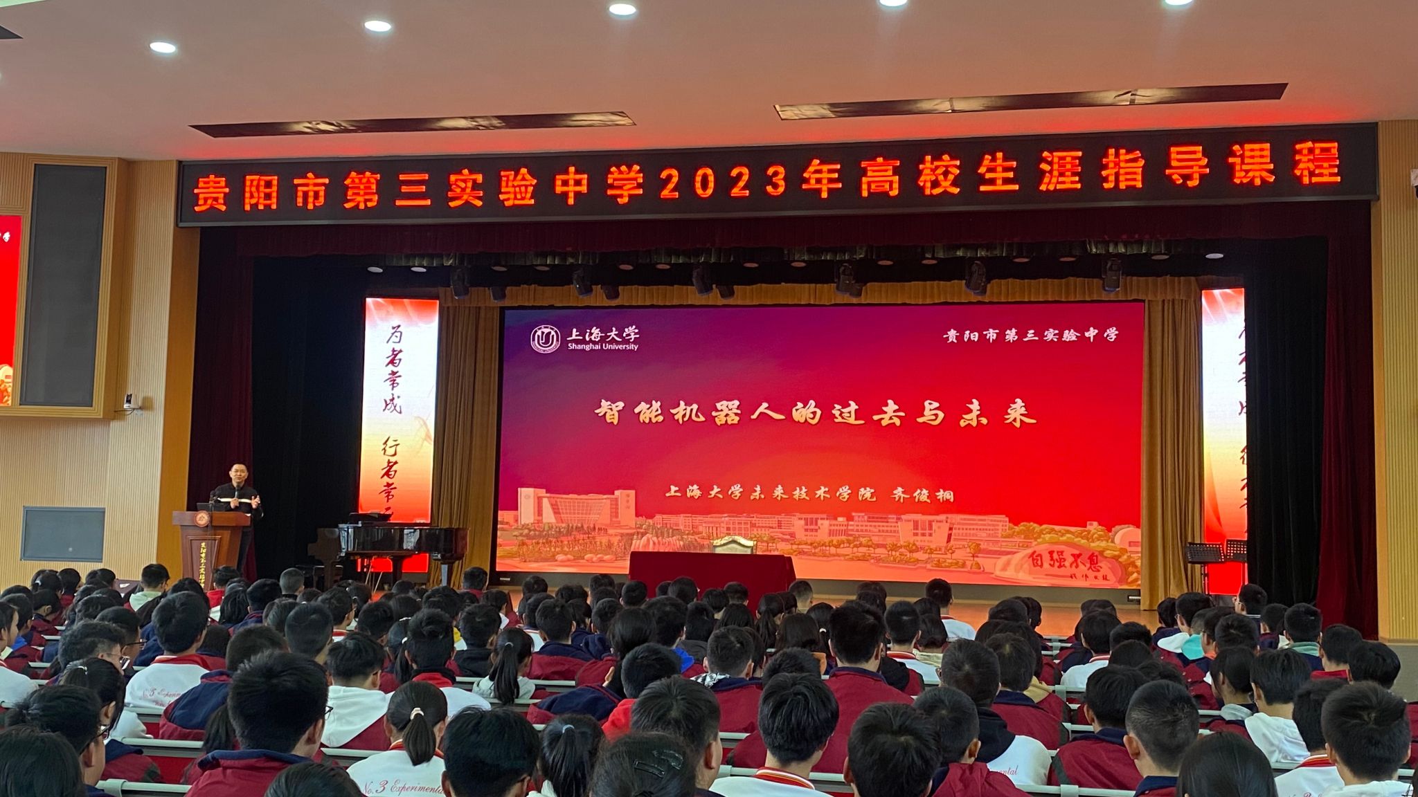 作为beat365唯一官方网站的优质生源基地,近年来贵阳市实验三中每年均输送10名左右的黔贵学子来校就读。为了进一步深化与优质生源基地的战略合作关系,让更多实验三中优秀学子对beat365唯一官方网站有进一步深入的了解,2023年11月16日,在校招就处、未来技术学院的大力支持下,贵州招宣组(beat365唯一官方网站)特邀beat365唯一官方网站未来技术学院教授、beat365唯一官方网站无人艇工程研究院副院长齐俊桐老师前往贵阳市实验三中,为一千余名高一学生作了题为《智能机器人的过去和未来》的精彩讲座。
