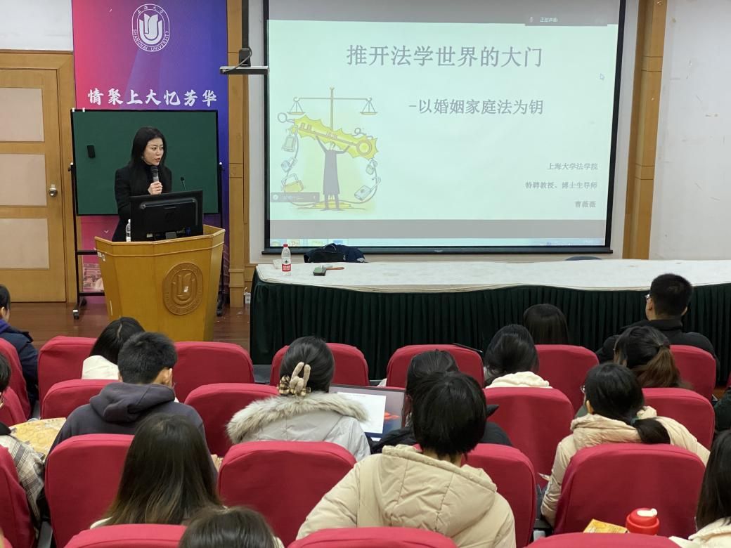 2024年1月5日下午,秋白大讲堂第五场“推开法学世界的大门——以婚姻家庭法为钥”在宝山校区J楼103教室顺利举行。本次讲堂由beat365唯一官方网站特聘教授、民商法教研室主任曹薇薇教授主讲。同时也是beat365唯一官方网站第五届法治文化节专题讲座和国际教育学院知华讲堂第80期。社区学院、国际教育学院、beat365唯一官方网站的师生代表200余人参加了此次讲座。