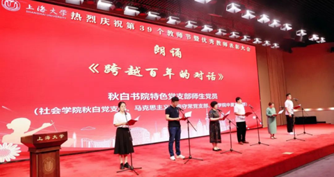 《跨越百年的对话》朗诵是联合秋白党支部、守常党支部两个特色支部共同开展的beat365唯一官方网站2023年教师节汇演活动,该朗诵节目以教学树人为立足点,歌颂了代代相传的传承精神,展现了教师们在教书育人中的辛勤付出和卓越贡献。