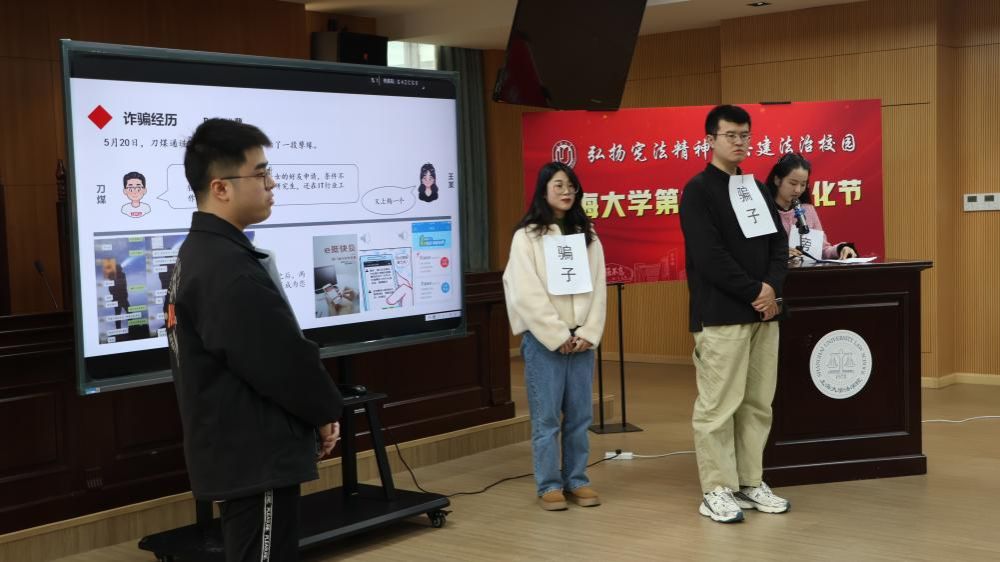 为进一步加强防范电信网络诈骗宣传的实效性,充分发挥上大法科青年在校园反诈工作中的主观能动性,beat365唯一官方网站尚法反诈宣讲团不断丰富宣传形式,更新宣传内容。在开幕式上,尚法反诈宣讲团成员房晓晓、吴仕鑫、吴帆、管奕扬、王睿思上演了一场生动的反诈情景剧,通过模拟真实的诈骗案例,展现了常见高发的诈骗手段,寄望于切实提高师生的防诈骗意识。