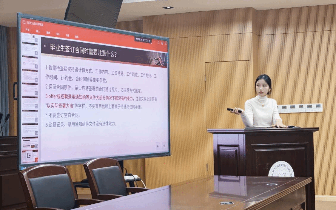 紧接着,徐炜针对若干求职关键环节法律要点,就风险防范及权益保护,为大家进行了清晰而生动的详细讲解。