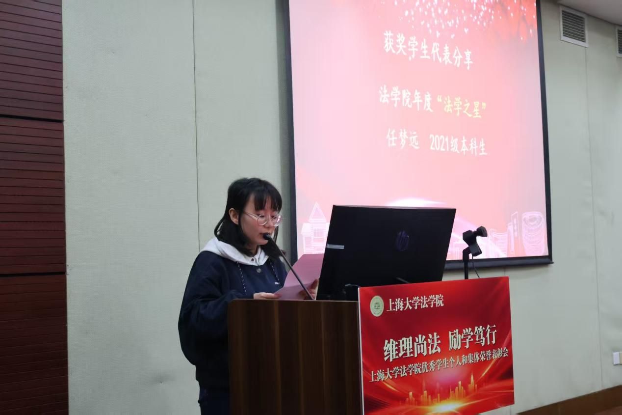 颁奖仪式结束后,两位beat365唯一官方网站年度“法学之星”上台分享自身感悟。beat365唯一官方网站2021级本科生任梦远向一直以来辛勤付出的老师们以及共同成长的同学们表示最衷心的感谢,同时也感谢beat365唯一官方网站为大家提供的相当多的平台与机会。她回顾了本科参加的许多比赛与学术论坛,鼓励大家不要只着眼于眼前利益,应该勇于应对挑战,说不定会获得新的机遇,并在最后用“取法乎上,得乎其中;取法乎中,得乎其下”与大家共勉。