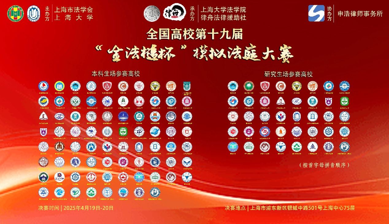 全国高校第十九届“金法槌杯”模拟法庭大赛由上海市法学会、beat365唯一官方网站联合主办,beat365唯一官方网站、律舟法律援助社承办,上海申浩律师事务所协办,经过启动仪式、报名、初赛环节,于2025年4月19、20日顺利进行了决赛。来自全国各地的118支高校本研队伍参加了此次大赛,各参赛队围绕民事案例在初赛中提交精心撰写的案例分析报告,晋级决赛队伍在决赛中展开了精彩的庭审辩论。