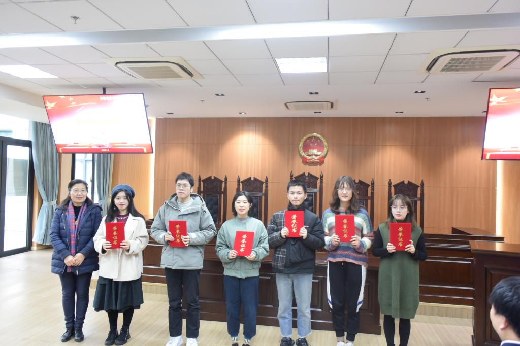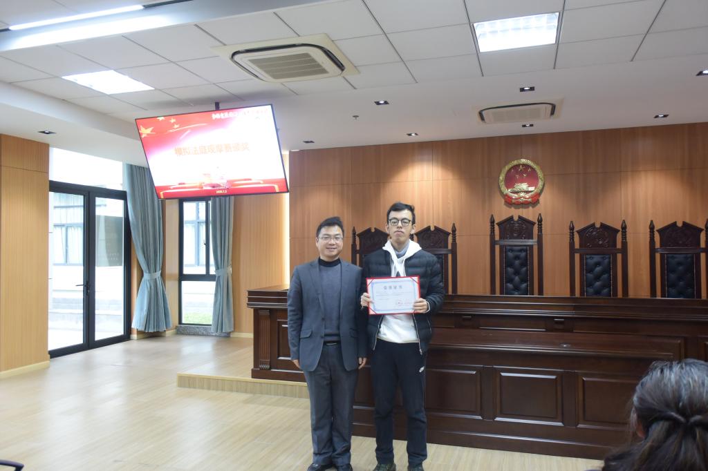 陈敬根老师为模拟法庭观摩赛获奖同学颁奖,审判组获得最佳组别奖。