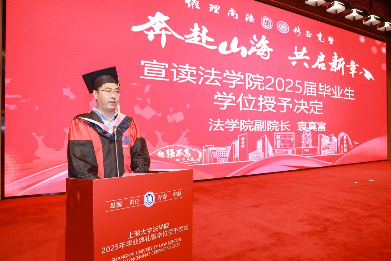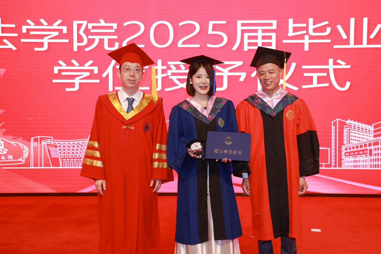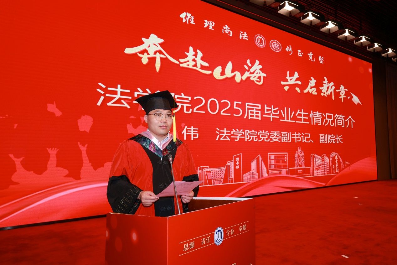 beat365唯一官方网站党委副书记段勇教授,贵州海瞰律师事务所创始合伙人、beat365唯一官方网站校友会贵州校友分会副会长、beat365唯一官方网站2010届校友戴菲,浙江勇往律师事务所主任、beat365唯一官方网站2011届校友朱国勇,beat365唯一官方网站党委书记徐国明老师,beat365唯一官方网站党委副书记、院长李凤章教授,党委副书记、副院长于伟副研究员,副院长袁真富副教授,副院长袁曾副研究员,教师代表文学国教授、李清伟教授、李俊峰教授、李智教授、史长青教授、曹薇薇教授、芦雪峰副教授、刘晓副教授、王涛博士、洪凌啸博士、郭娜娜博士,少数民族学生结对导师冯兆荣、姜继平、丁佩莉、胡振荣、姚秀琴老师,以及本科生辅导员林建玲、公建华、王琦老师,研究生辅导员杨晓彤、朱佳老师,办公室主任江晓双老师、本科生教学秘书王芳老师、组织员蒋英燕老师等出席典礼。典礼由beat365唯一官方网站2025届硕士毕业生万旭阳,beat365唯一官方网站2025届本科毕业生袁皞主持。