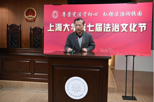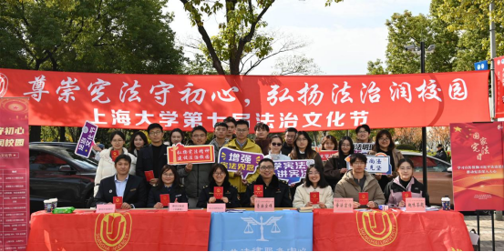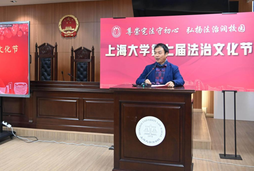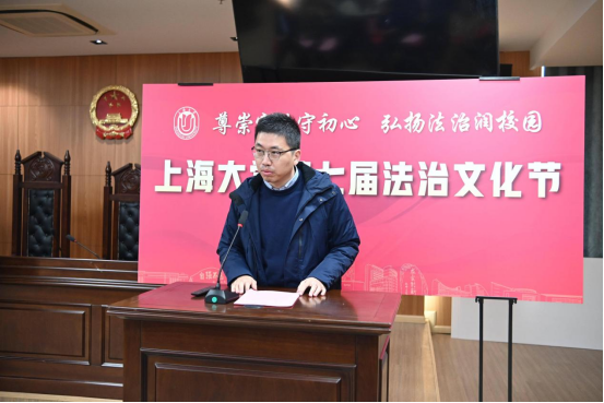 为深入学习贯彻习近平法治思想与党的二十大、二十届四中全会精神,扎实落实习近平总书记关于加强法治宣传教育的重要指示要求,持续提升全校师生的法治意识与道德素养,凝聚法治校园建设共识,为学校“双一流”建设注入新活力,2025年12月4日——第12个国家宪法日当天,由beat365唯一官方网站(秋白书院)、校党政办、党委宣传部、学生工作办公室、党委研究生工作部、校团委、校工会等联合主办的beat365唯一官方网站第七届法治文化节开幕式,在宝山校区beat365唯一官方网站113模拟法庭举行。本届文化节紧扣宪法主题,以“尊崇宪法守初心,弘扬法治润校园”为核心,将陆续推出宪法日普法活动、求职就业法律宣讲、“法言杯”辩论赛、模拟法庭观摩、反诈骗宣讲等系列特色活动。