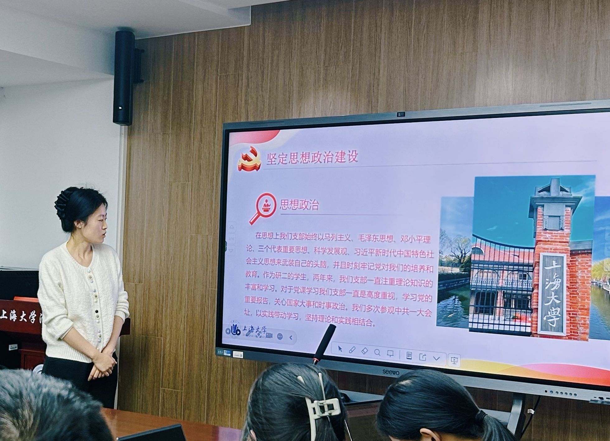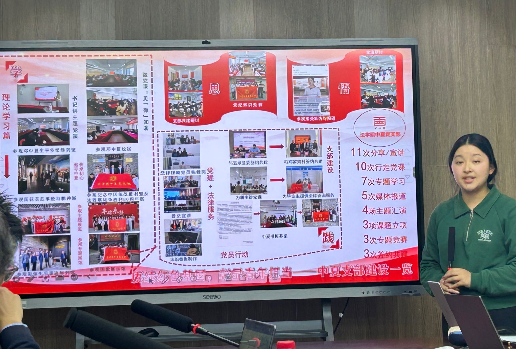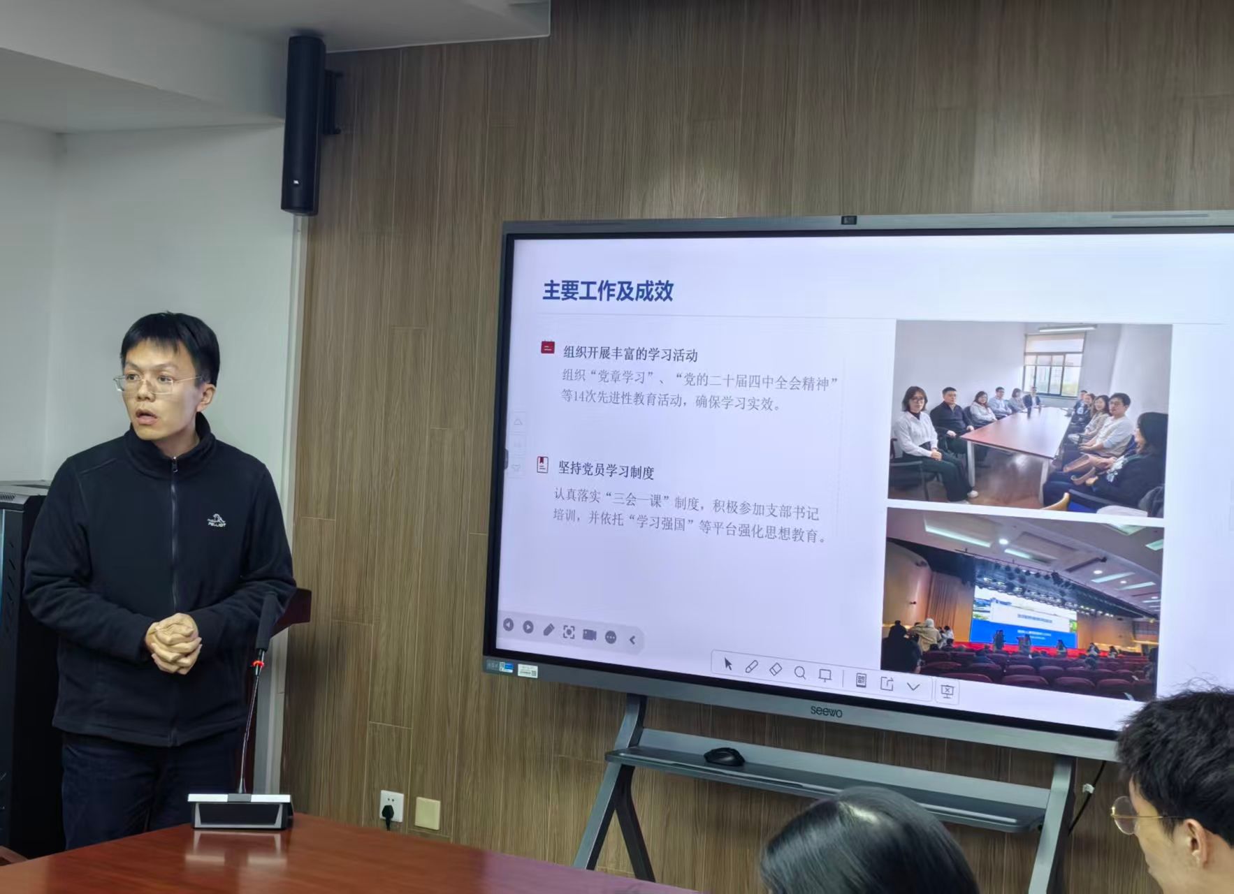 述职评议会按照教工党支部、纵向学生党支部、横向学生党支部三个组别依次进行全覆盖现场述职。12位党支部书记围绕2025年度党建工作开展情况、特色亮点、存在问题及下一步计划等方面进行汇报,展示了一年来各支部在理论武装、组织建设、党建与业务融合、党员教育管理等方面的积极探索与扎实成效。