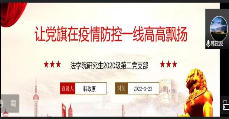 研究生党支部通过线上形式,开展“让党旗在疫情防控一线高高飘扬,做好‘五个一’”的主题党日教育,就党员如何在疫情防控中发挥战斗堡垒作用展开专题学习和专题讨论。