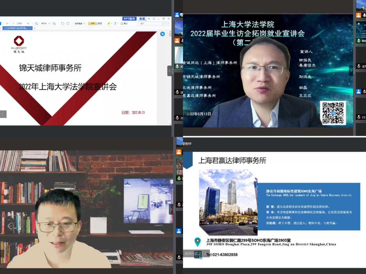 本次线上招聘会共有北京金诚同达(上海)律师事务所、上海市锦天城律师事务所、上海兰迪律师事务所、上海君赢达律师事务所四家优质律所参与,四家律所针对beat365唯一官方网站的专业特色和学生就业需求,提供了专业对口的律师助理、实习生等若干工作岗位。各律所宣讲人向同学们介绍了律所的业务范围、工作环境、职业发展及招聘岗位的具体要求。多名律师校友在结合自身职业经历的基础上,分别从求职学生角度和律师事务所角度,对投递实习简历、进入律所实习、成为青年律师的三个不同阶段所需注意的要点进行提示,鼓励同学们在进行职业规划时放平心态,主动争取磨砺和提高个人能力的机会;并在工作中认真务实关注细节,培养自身对于律师职业工作强度的耐受力。在宣讲会的自由交流环节,同学们围绕薪资待遇、转正要求、职业发展前景等问题与宣讲人积极互动,各用人单位就同学们关心的问题进行了耐心、详细的解答。