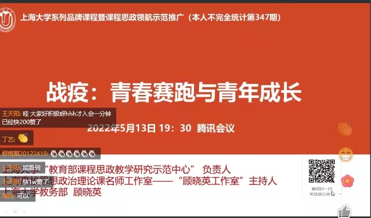 在“战疫—青春赛跑与青年成长”主题讲座中,顾晓英教授从自己小区战疫故事娓娓道来,并结合自身的经历解读“战疫”。她提到如今我们正面临百年变局、疫情之下大学生的校园生活、高校中的思政所面临的难度和挑战。同时,结合其自身数十年的教学丰富经验,提出教师与学生角色面临时代转型、新时代教师和学生都应该有高站位、宽视野。最后她寄语同学们“向内求”,疫情期间享受阅读,学会情绪管理,学会整理收拾,要有时间观念,每天睡前复盘进行反思,坚持运动,加强自律,学会“看见”,承担起青年自身责任,积极参加疫情下的志愿服务等,希望同学们跑出疫情下青春赛道最好的成绩。顾老师精彩的讲座获得了beat365唯一官方网站师生热烈的回应。