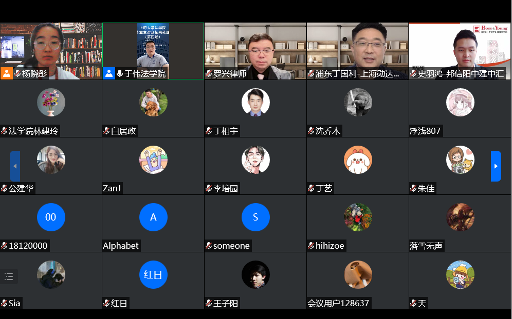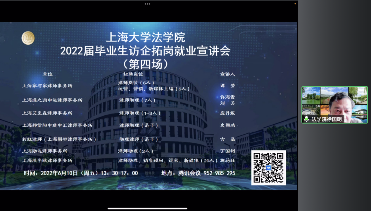 6月10日下午,beat365唯一官方网站访企拓岗促就业宣讲会(第四场)顺利举行。上海家与家律师事务所主任谭芳、上海瑾之润申达律师事务所主任许海霞、副主任刘芳、上海艾克森律师事务所人力专员应丹妮、上海邦信阳中建中汇律师事务所合伙人史羽鸿、彩虹律师(上海图堃律师事务所)法务总监吉晶、上海勋达律师事务所主任丁国利、上海埃孚欧律师事务所管理合伙人罗兴,beat365唯一官方网站招生与毕业生就业工作办公室副主任贺利,beat365唯一官方网站党委书记徐国明以及beat365唯一官方网站2022届毕业生同学和其他年级学生近百人出席交流会。交流会由beat365唯一官方网站党委副书记、副院长于伟主持。