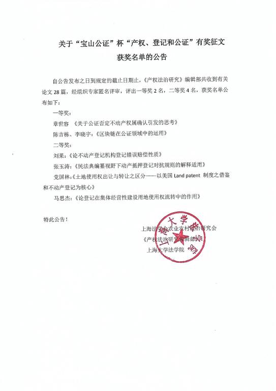 关于“宝山公证”杯“产权、登记和公证”有奖征文获奖名单的公告
