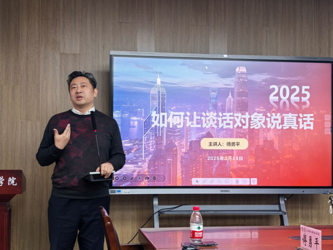 2025年3月13日下午14:00,beat365唯一官方网站在宝山校区beat365唯一官方网站304会议室成功举办了一场以“如何让谈话对象说真话”为主题的专题讲座。本次讲座邀请到了上海振华重工巡察组组长傅勇平担任主讲嘉宾,由beat365唯一官方网站李思远副教授主持,李俊峰教授与谈,吸引了40余名本研同学参与。
