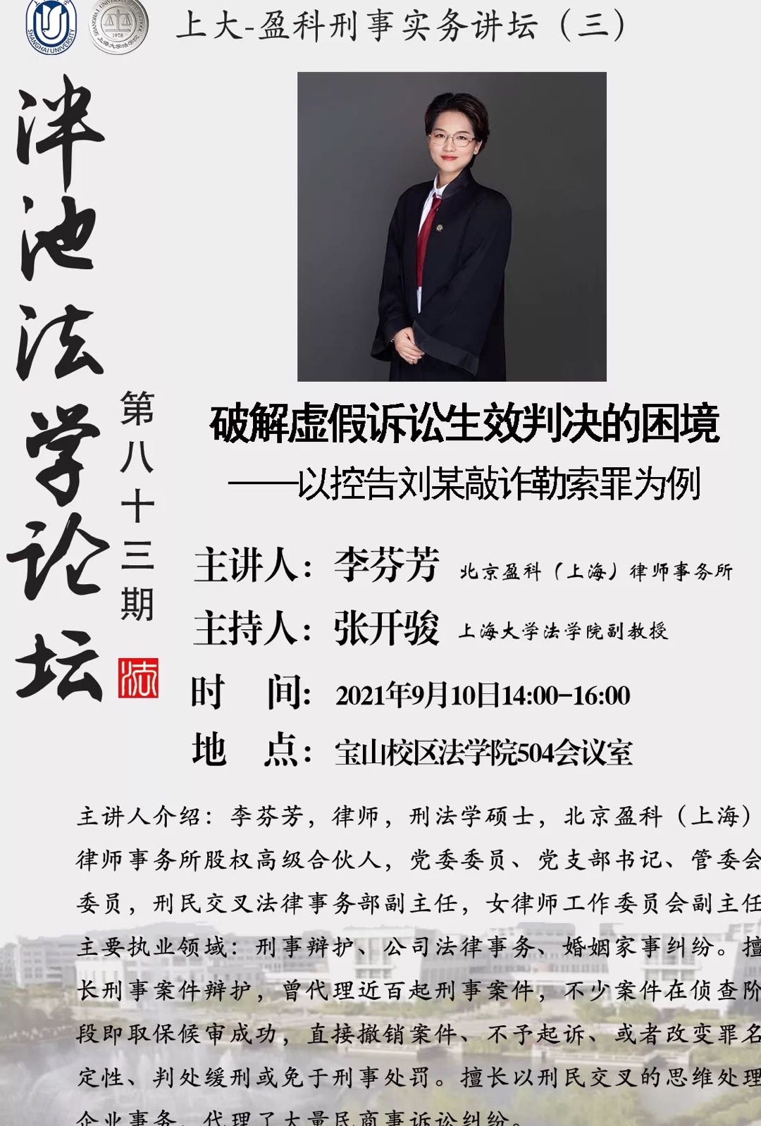 泮池法学论坛第83期预告:“破解虚假诉讼生效判决的困境--以控告刘某敲诈勒索罪为例”