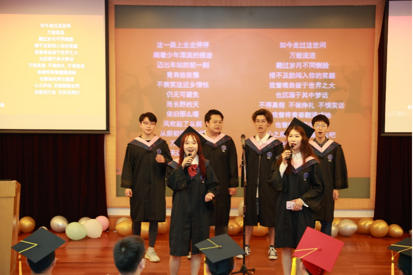 暖场中,本科毕业生李容佳、余融静、孙云森、许哲豪、汪迪宣、张竣彦通过倾情演唱《起风了》、《少年》、《你曾是少年》等多首歌曲,拉开了毕业典礼的序幕。