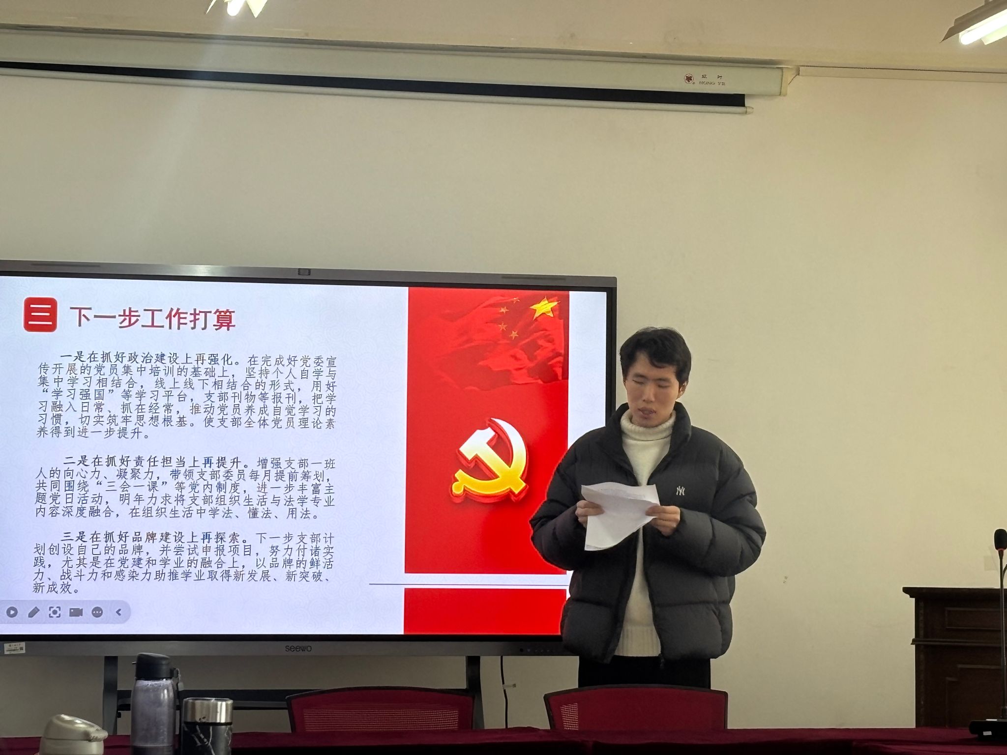 最后,徐国明书记作总结。他首先对13个师生党支部在2024年努力推进的各项工作与取得的成绩和荣誉表示肯定,感谢各位支部书记的辛苦付出,并对各支部书记本年度的述职报告提出了完善建议,对2025年学院基层党建工作的规划与建设提出要求:一是要抓好基层党建工作检查反馈问题的即知即改;二是师生党支部要落实好主题党日、“三会一课”制度,夯实党建工作基础;三是要深化特色党支部建设、凝练党建品牌,充分发挥法学学科的专业特色;四是要发挥好党支部的战斗堡垒作用,激发教职工党员、学生党员的活力和创造能力。