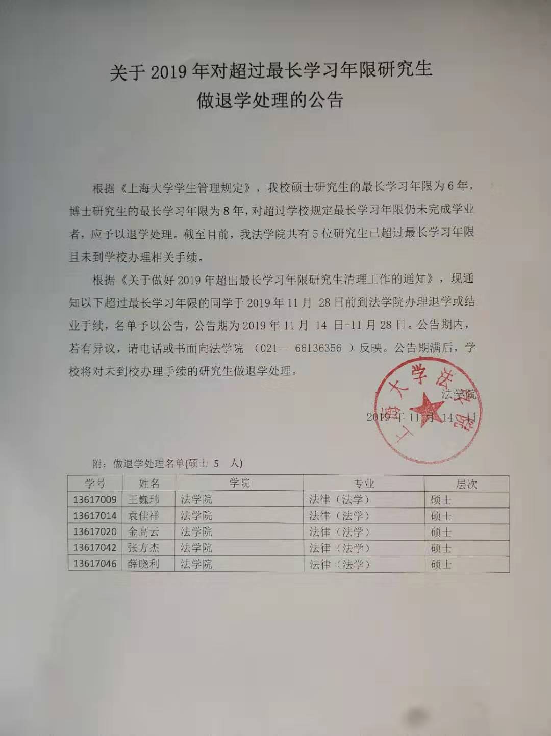 关于2019年对超过最长学习年限研究生做退学处理的公告