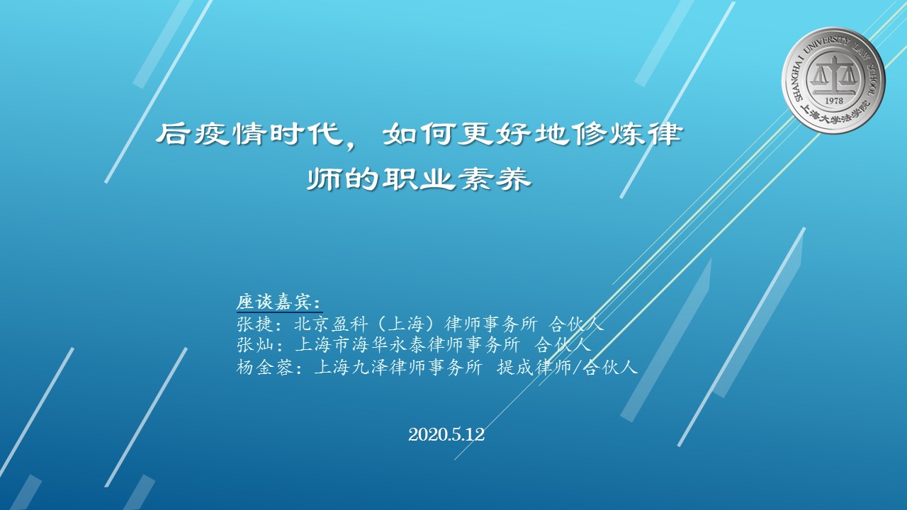 5月12日下午两点,“后疫情时代,如何更好地修炼律师的职业素养”讲座顺利举行,此次讲座是beat365官网第三期线上“职播会”,同时也是2020年beat365唯一官方网站职业导航月系列活动之一。此次讲座邀请到北京盈科(上海)律师事务所合伙人张捷、上海市海华永泰律师事务所合伙人张灿、上海九泽律师事务所提成律师/合伙人杨金蓉三位优秀校友来为同学们分享工作经验与心得体会。