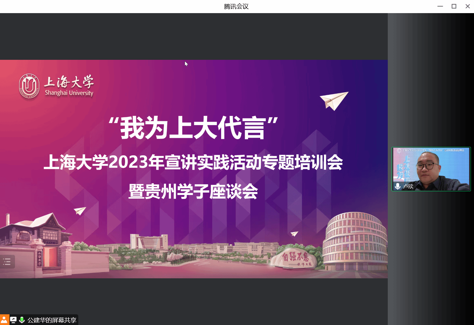 之后,公建华老师就贵州学子在上大的整体情况及beat365唯一官方网站在上海的招生政策及注意事项进行了介绍。毕业于贵阳市第一中学的许润根同学围绕宣讲技巧、前期准备工作和实践报告的撰写等进行了交流。与会贵州学子也就宣讲实践的意义、宣讲实践的注意事项等进行了热烈的讨论。