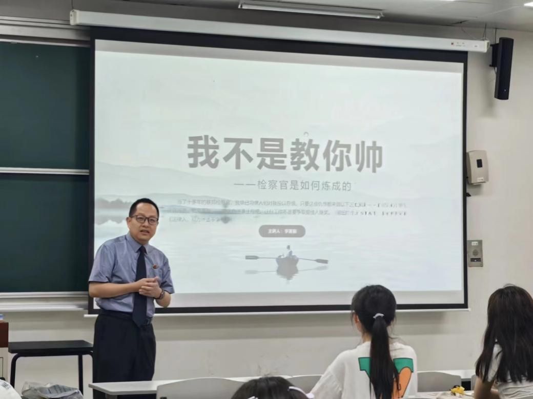 6月21号上午,上海市嘉定区人民检察院的李鉴振检察官给同学们带来了“检察官说法面对面”职场分享。李检察官以幽默风趣的故事引入,讲述了作为一名检察官的亲身经历,让同学们更全面的深入了解检察官这个职业。同时,李检察官也和同学一起探讨了法治精神与司法实践,这对于同学们探索职业道路以及理解法律问题都具有十分重要作用。通过李老师的分享,同学们对于法律职业选择有了更加深入的理解,也增加了同学们投身于法治建设的信心。