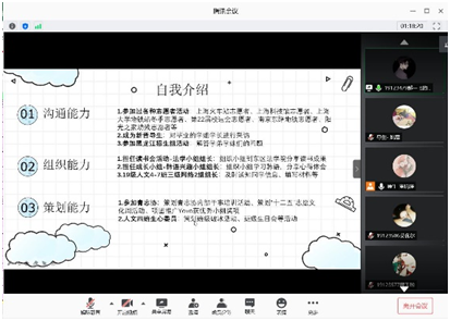 在自我介绍环节结束后,董瑞瑾学姐主持了班级临时负责人竞选活动,每位参与竞选的同学进行时长不超过4分钟的自我陈述。竞选环节中,四位报名的同学进行自我介绍以及拉票。最后在线上QQ群内匿名投票,每人限投两票。竞选结果中,男女中各票数最高者郝一飞同学和李佳豪同学竞选成为临时负责人。
