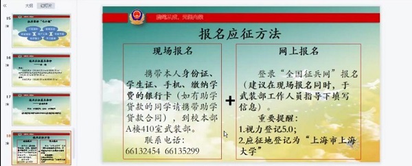 首先林建玲老师给大家看了一段振奋人心的入伍宣传视频,之后,林老师从应征入伍的意义、报名方式、优惠政策、付出与收获等方面为大家详细介绍了上大关于征兵入伍的政策,林老师希望大家积极报名,为国、为校争光。