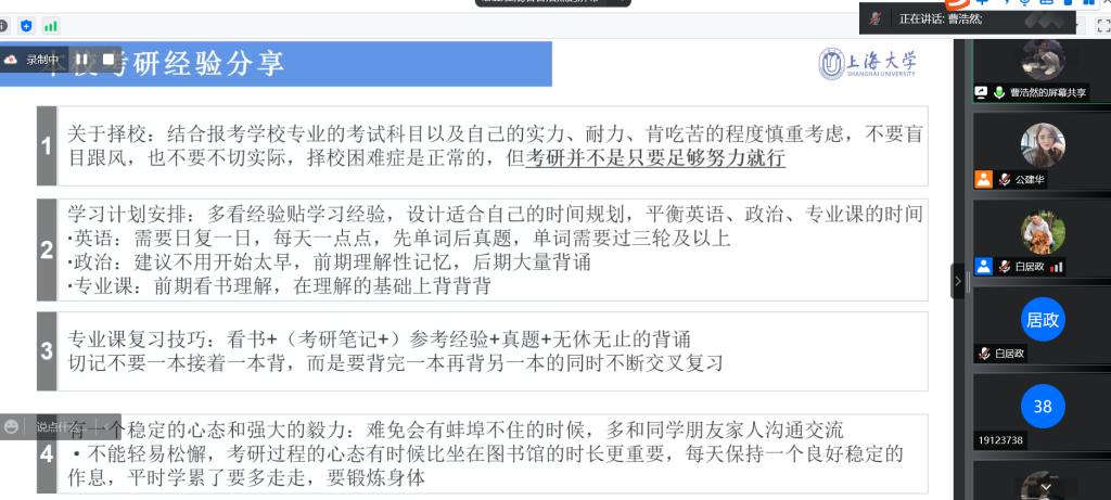 2022年5月19日晚上,beat365唯一官方网站2022年考研经验朋辈分享交流会通过腾讯会议顺利举行。本次会议由beat365唯一官方网站2018级本科生曹浩然、姬雪薇、彭建和黄振国做经验分享。beat365唯一官方网站本科生辅导员公建华老师和30余位本科生在线参加。分享会由beat365唯一官方网站2018级本科生白居政主持。
