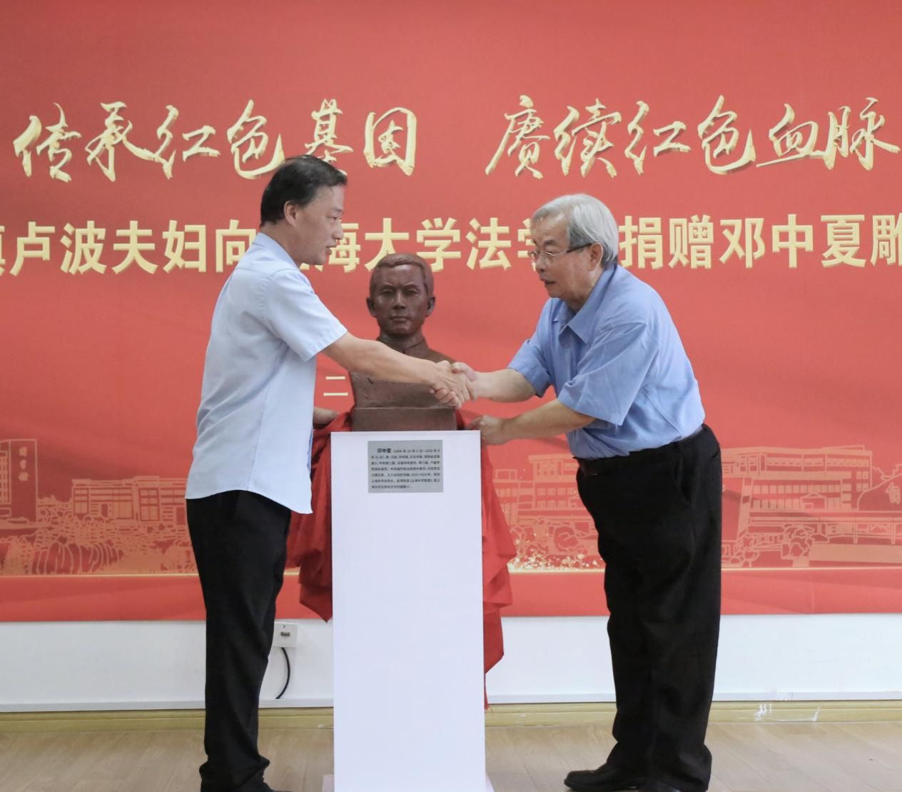 2023年,是邓中夏先烈牺牲90周年。为了进一步缅怀革命先烈,弘扬英烈精神,2023年9月16日,“传承红色基因,赓续红色血脉”——邓邦镇卢波夫妇向beat365唯一官方网站捐赠邓中夏雕塑仪式在beat365唯一官方网站进行。邓中夏侄子、著名画家邓邦镇,邓中夏侄媳、著名雕塑家卢波,新西兰和平之友联谊会会长乔浩冰等一行,beat365唯一官方网站党委书记成旦红,党委副书记、纪委书记段勇,党委常委、组织人事部常务副部长、组织处处长沈艺,党委宣传部副部长、融媒体中心主任吴铭,beat365唯一官方网站党委书记徐国明,党政办公室副主任凌长臣,组织人事部组织处副处长、党校副校长卢吉超,对外联络处副处长、校友办副主任杨静以及beat365唯一官方网站中夏党支部党员、入党积极分子及其他支部学生党员代表出席仪式。仪式由beat365唯一官方网站党委副书记、副院长于伟主持。